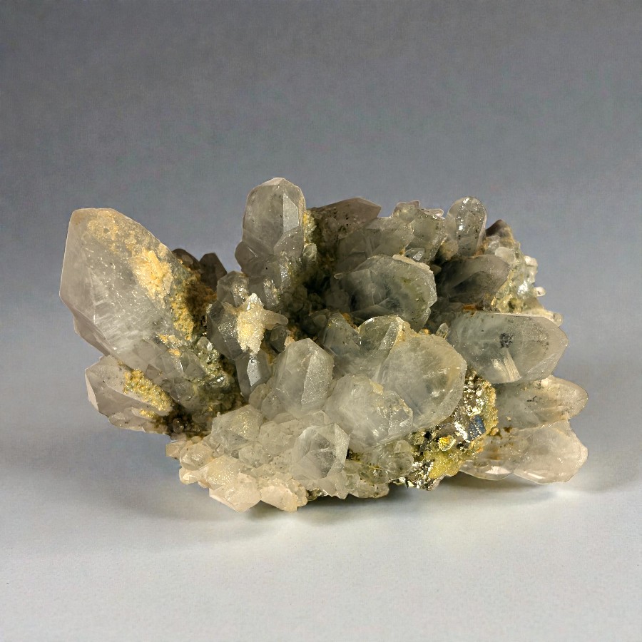 Ez a természetes kristályklaszter hegyikristályból áll, amelyet helyenként jól felismerhető pirittelepek egészítenek ki. Az áttetsző, világos kristálycsúcsok és a pirit fémes, aranyszínű felvillanásai erős vizuális kontrasztot hoznak létre, ami különösen izgalmassá teszi ezt a darabot. A pirit nem elszórt szemcsék formájában jelenik meg, hanem határozottabb telepekben, így valódi ásványtani társulásról beszélhetünk, nem pusztán felszíni elszíneződésről.