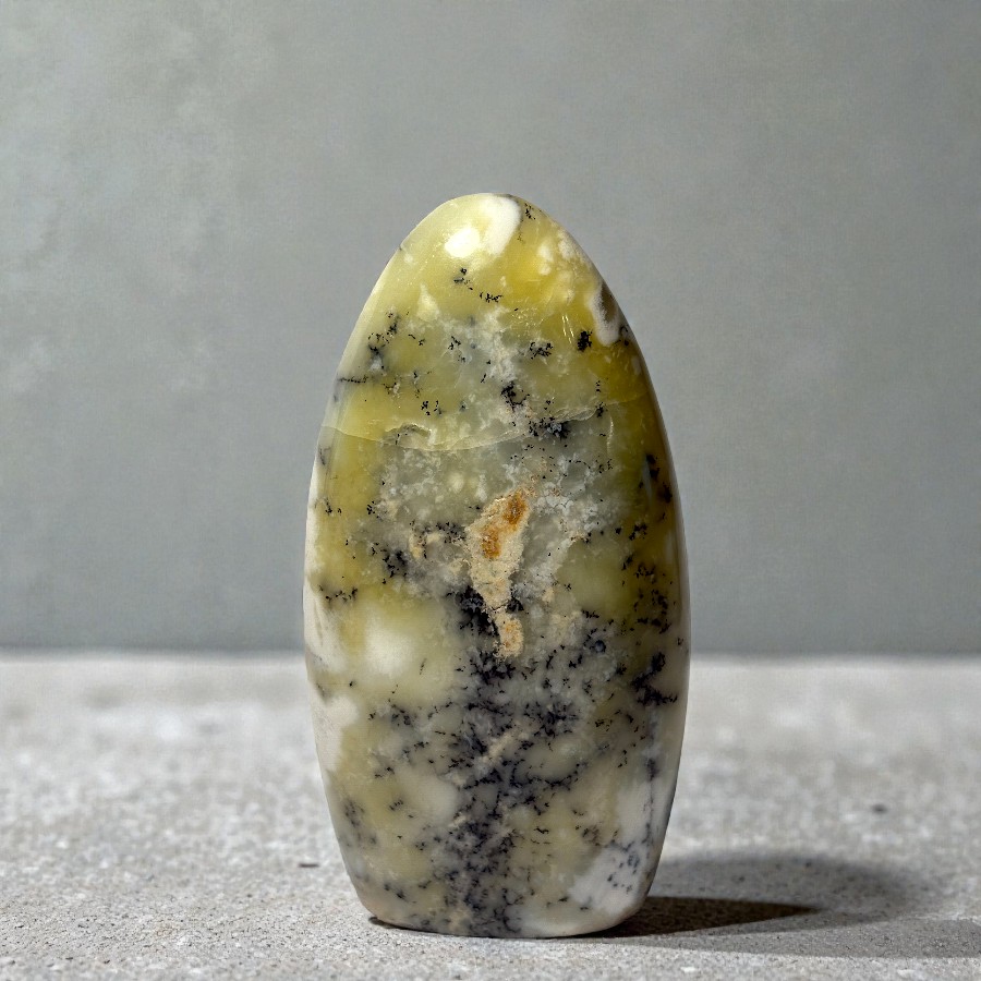 A Merlinit valójában nem egy önálló ásványfajta, hanem egy egyedi geológiai képződmény, amely a kvarc vagy opál alapmátrixában megjelenő fekete, dendrites mangán-oxid (pszílomelán) zárványok együtteséből áll. Ez a különleges kompozíció adja a jellegzetes, faágakra, páfrányokra vagy mohára emlékeztető mintázatot. Bár mint elnevezés a modern ásványtani gyakorlatban tűnt fel, a benne rejlő dendrites struktúrák szimbolikája – a természetes növekedés, a földi gyökerek és az élet örök körforgása – mélyen rezonál az ősi, természetközpontú hagyományokkal. Spirituális kontextusban azok kedvelik, akik a tudatalatti tartományait és a belső bölcsességet szeretnék finoman közelíteni, mindig a józan, földhözragadt tapasztalás talaján maradva.
