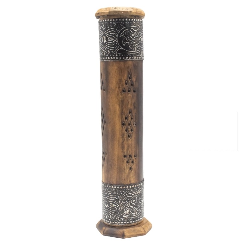 Fából készült füstölőégető torony, leemelhető a torony a talapzatról, és a talapzatba helyezhető be a füstölő. Visszahelyezve a tornyot, a lyukakon keresztül áramlik ki látványosan a füst. Hagyományos bambuszpálcás- és kúpfüstölők égetésére egyaránt alkalmas. Csodás és praktikus dísze ez a füstölőégető torony lakásunknak. Csak felnőtt felügyelete mellett égessen füstölőt!
