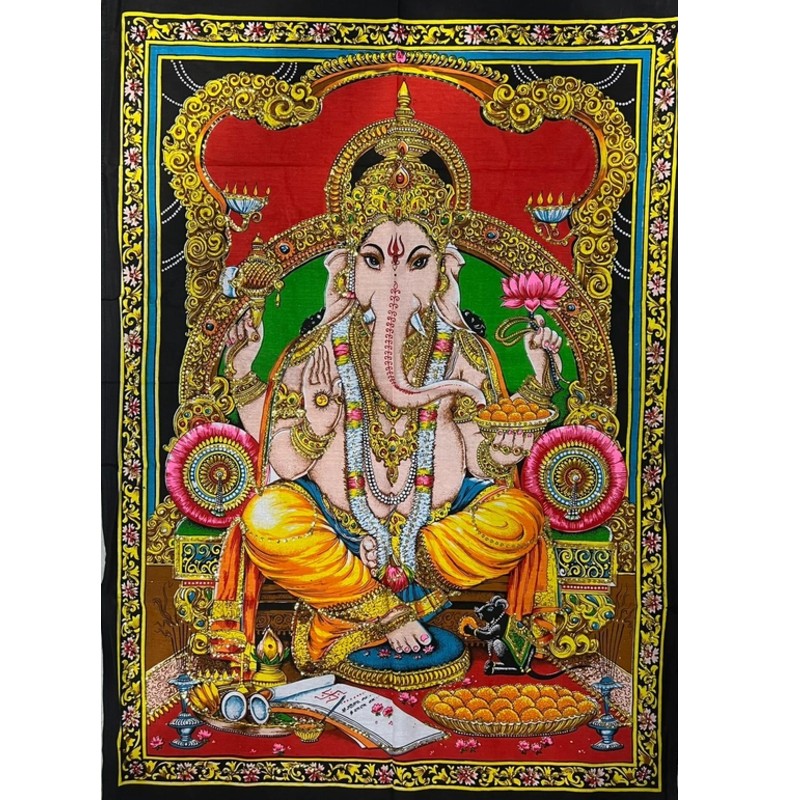 Ez a lenyűgöző, kézzel készült indiai pamut faliszőnyeg Ganéshát, az akadályok elhárítóját és a szerencse istenét ábrázolja trónusán ülve, fényes arany és élénk rózsaszín színekben. Ganésha az új kezdetek, a tudás, a siker és a bölcsesség szimbóluma – jelenléte a térben harmóniát, bőséget és védelmet teremt.