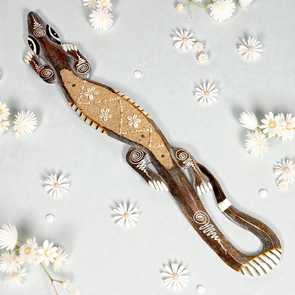 97 cm hosszú óriás gekkó fafaragás, kagylókkal díszítve.
