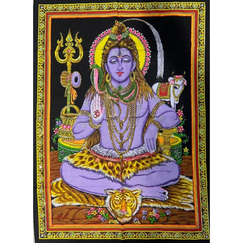 Shiva lilás testtónusa a végtelen tudat szimbóluma, amely túlmutat a földi formán. Kezén az „Om” jel a teremtés ősi rezgését idézi meg. A háttérben látható Nandi bika az odaadás és erő jelképe, míg a Trishula (háromágú szigony) a test, az elme és a lélek fölötti uralmat jelenti. A kígyó a nyakán a kundalini energiát, a tigrisbőr pedig az ösztönök feletti győzelmet szimbolizálja.